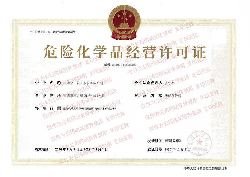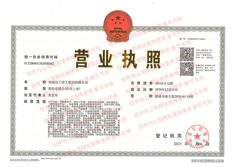 Nantong Chemical & Light Industry Co., Ltd. was established in July 1963, and was restructured in 1997 with a registered capital of CNY 101.16 million.Since its inception, the company has consistently upheld a business ethos rooted in "integrity as the foundation". It has earned an outstanding reputation in the commercial community by consistently fulfilling its commitments: making timely and full payments to domestic and international suppliers; delivering products on time with guaranteed quality, accurate quantity, and fair pricing; and repaying financial institutions promptly and in full.